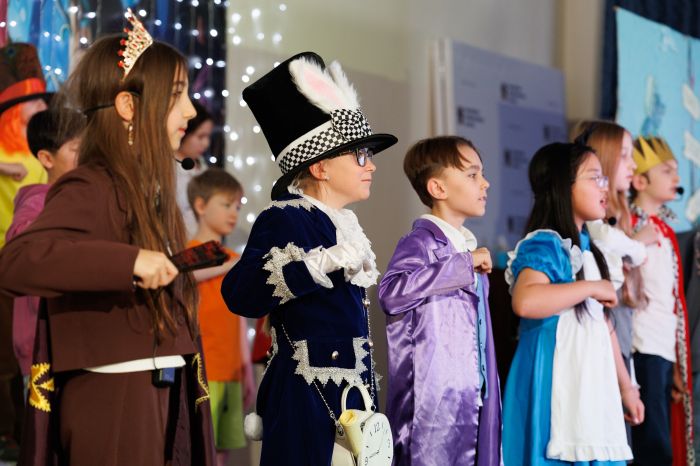 At School №2, students and teachers worked together to create a charming stage production inspired by Lewis Carroll’s Alice in Wonderland.